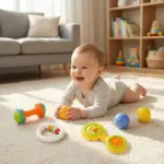 Different rattles produce gentle sounds to stimulate hearing and curiosity.
