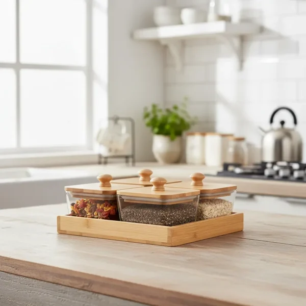 مصنوعة من خيزران عالي الجودة مع علب زجاجية شفافة، تضيف هذه المجموعة لمسة دافئة وعصرية لأي طاولة أو مطبخ.