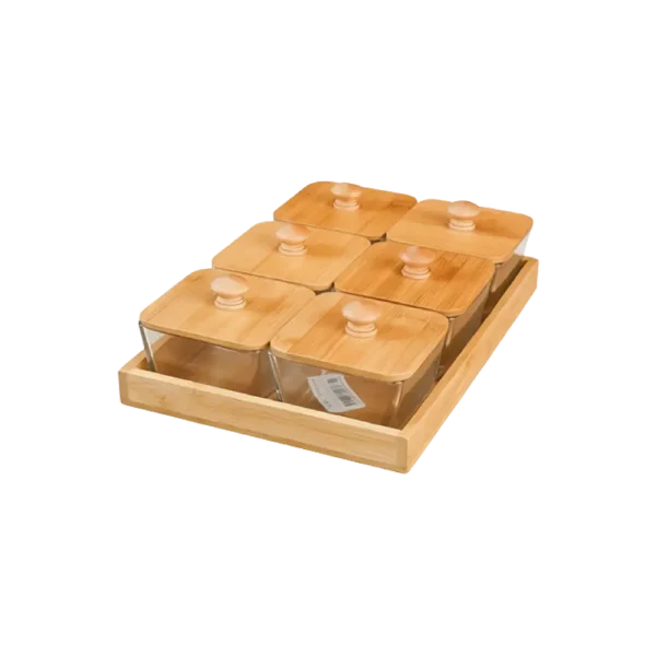 Bamboo Serving Tray with 6 Glass Jarsصينية تقديم من الخيزران مع 6 علب زجاجية