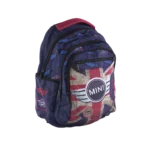 The backpack offers multiple compartments, including a large main compartment for books and school supplies, a front pocket for smaller items, and side pockets for water bottles or other essentials.