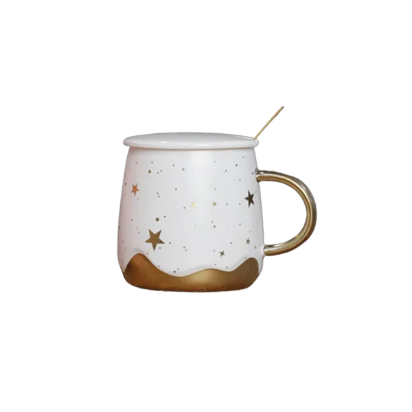 Ceramic Golden Stars White Mug with Lid & Spoon