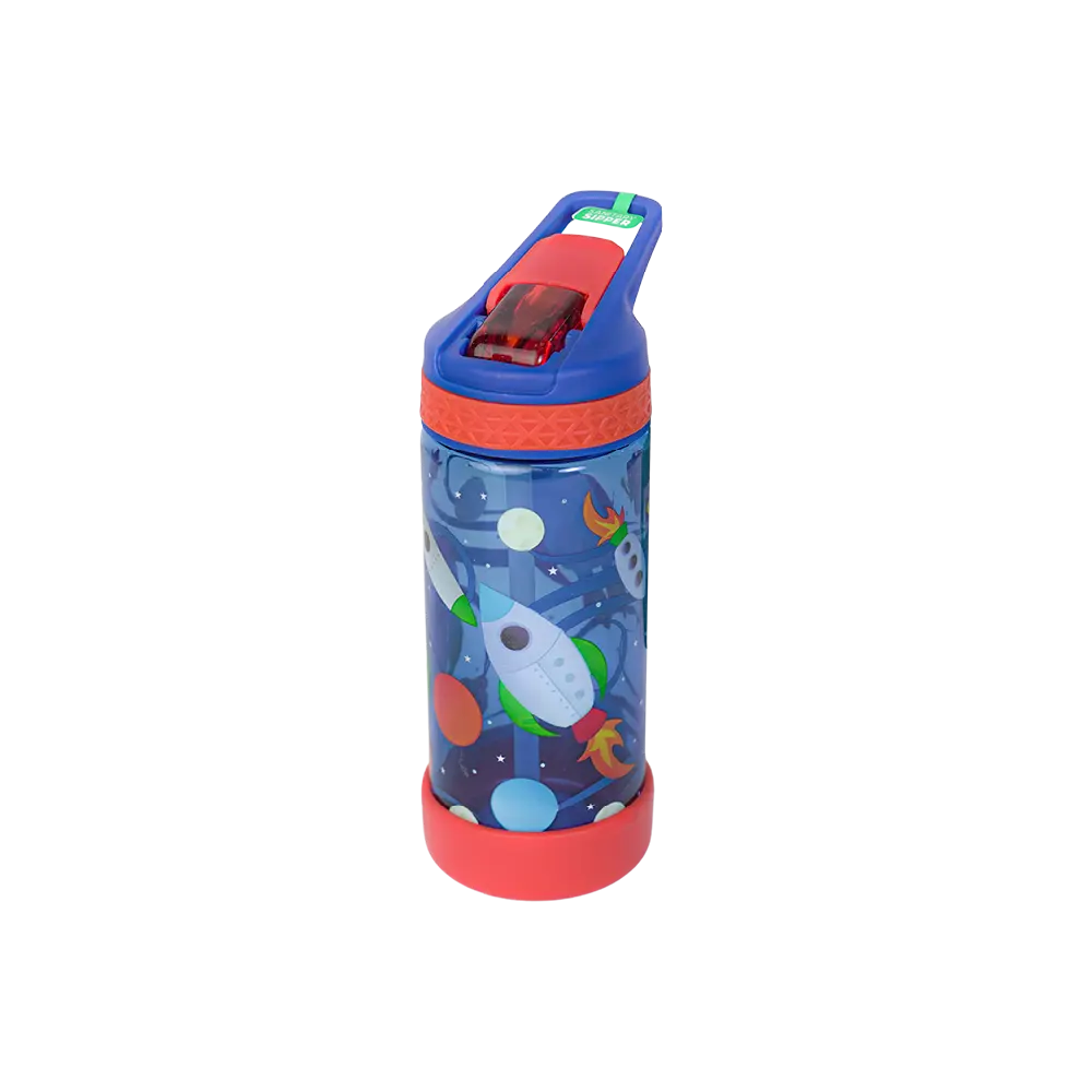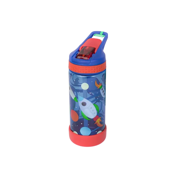 The bottle features a fun and colorful rocket and space theme, making it highly appealing to children.