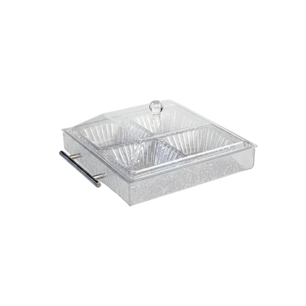 Interior includes four evenly separated sections, ideal for organizing and serving snacks, dry fruits, candies, nuts, condiments, or appetizer assortments without mixing contents.