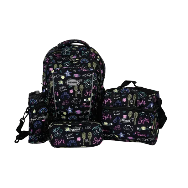 Set Includes: 1 Backpack, 1 Pencil Case, 1 Water Bottle, 1 Bottle Bag and 1 Lunch Bag.