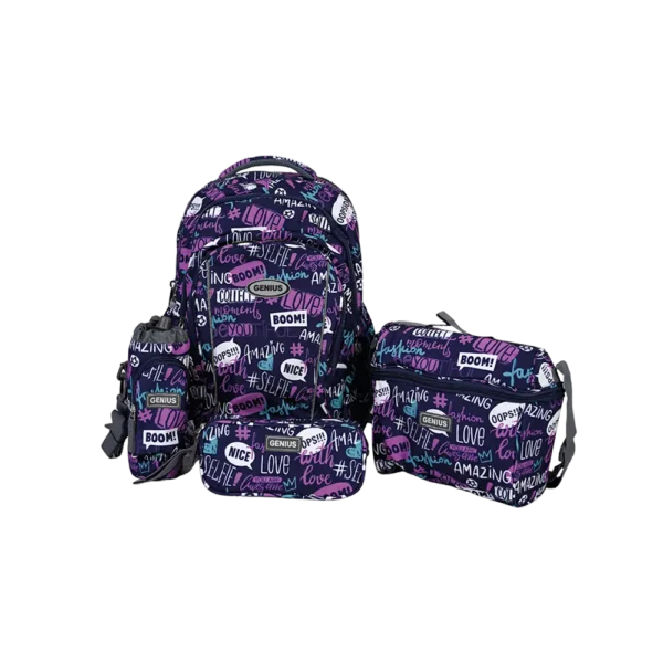 Set Includes: 1 Backpack, 1 Pencil Case, 1 Water Bottle, 1 Bottle Bag and 1 Lunch Bag.