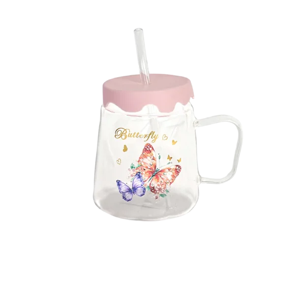 Glass Butterfly Design Mug with Silicone Pink Lid