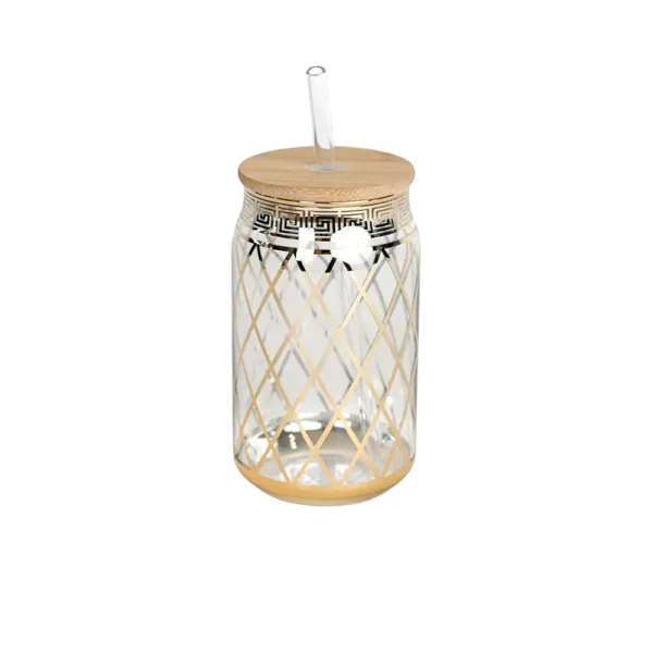 Glass Golden Patterend Design Mug with Bamboo Lid and Straw