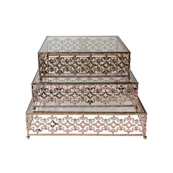 Antique gold finish with detailed scrollwork and glass base on each tier.