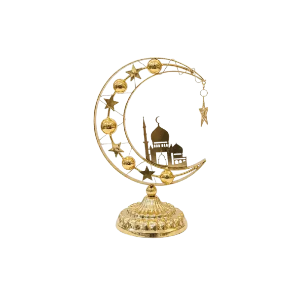 Features a crescent moon with mosque silhouette, stars, and hanging charm symbolizing Ramadan and Eid.