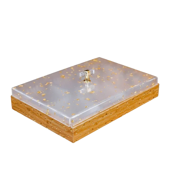 The top cover is crafted from high-quality frosted acrylic embedded with shimmering gold flakes, giving the box a luxurious, modern look perfect for display.