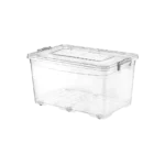 The bin is made from a strong, clear plastic material that allows visibility of the contents inside without needing to open the lid. The material is resistant to impact and wear, providing long-lasting durability.