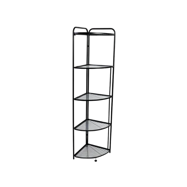 Offers five open wire shelves for holding plants, toiletries, kitchen supplies, or decorative items.