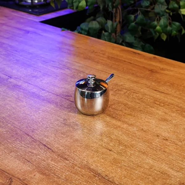 Mirror Finish Stainless Steel 300ml Sugar Bowl with Spoonسكرية ستانلس ستيل 300 مل بلمسة لامعة مع ملعقة