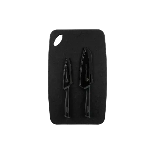 The set features a sturdy cutting board with a textured, non-slip surface to ensure stability while chopping and slicing.