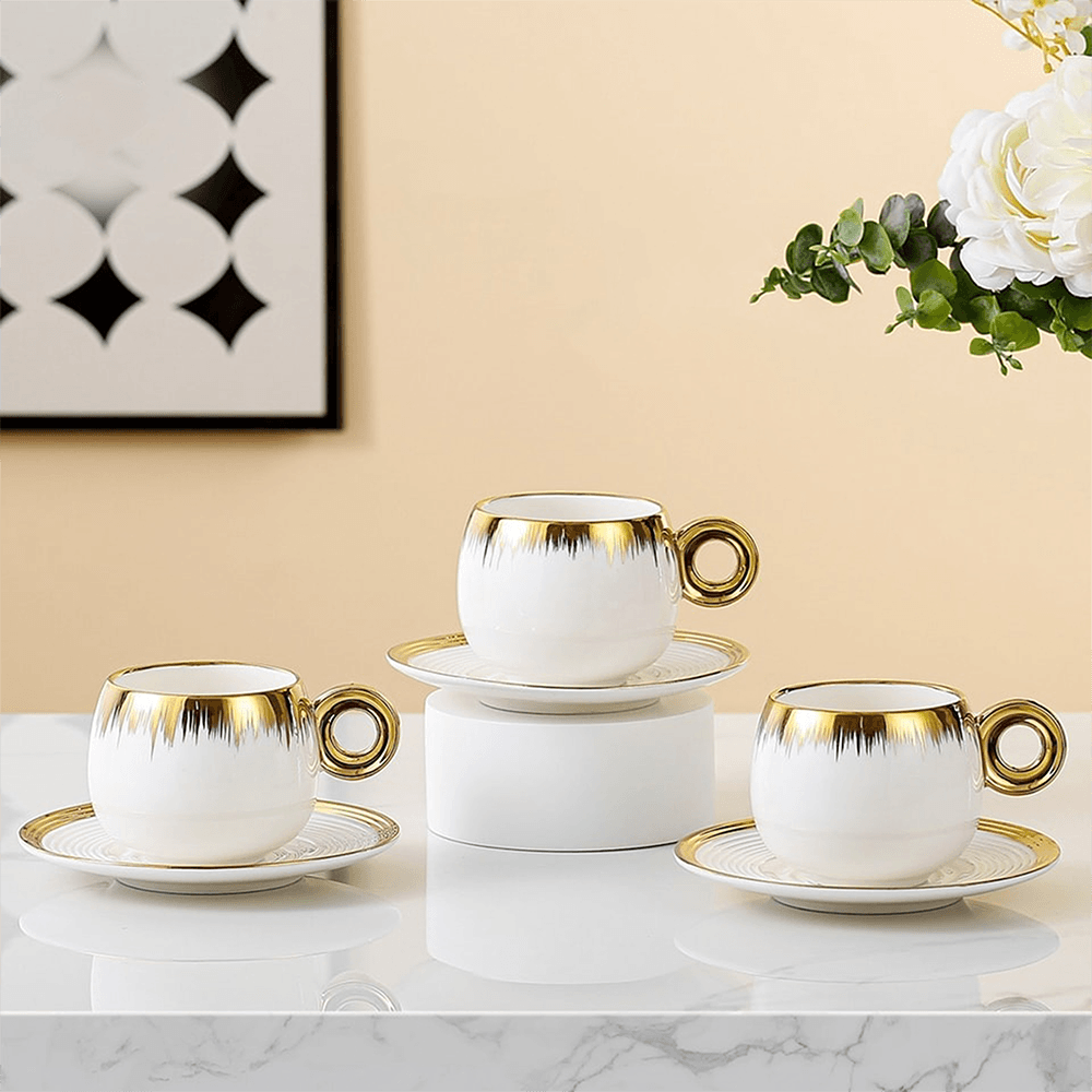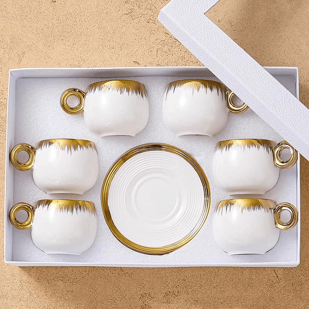 Momaz 6Pcs Porcelain White & Gold Tea Cups with Dishes