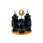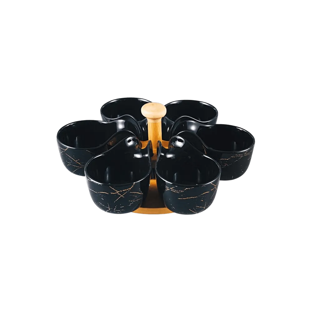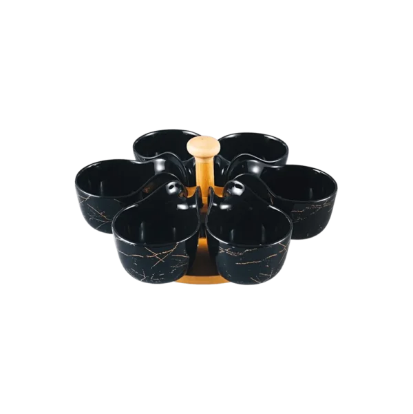 The set is composed of half a dozen of round serving cups and a wooden stand.