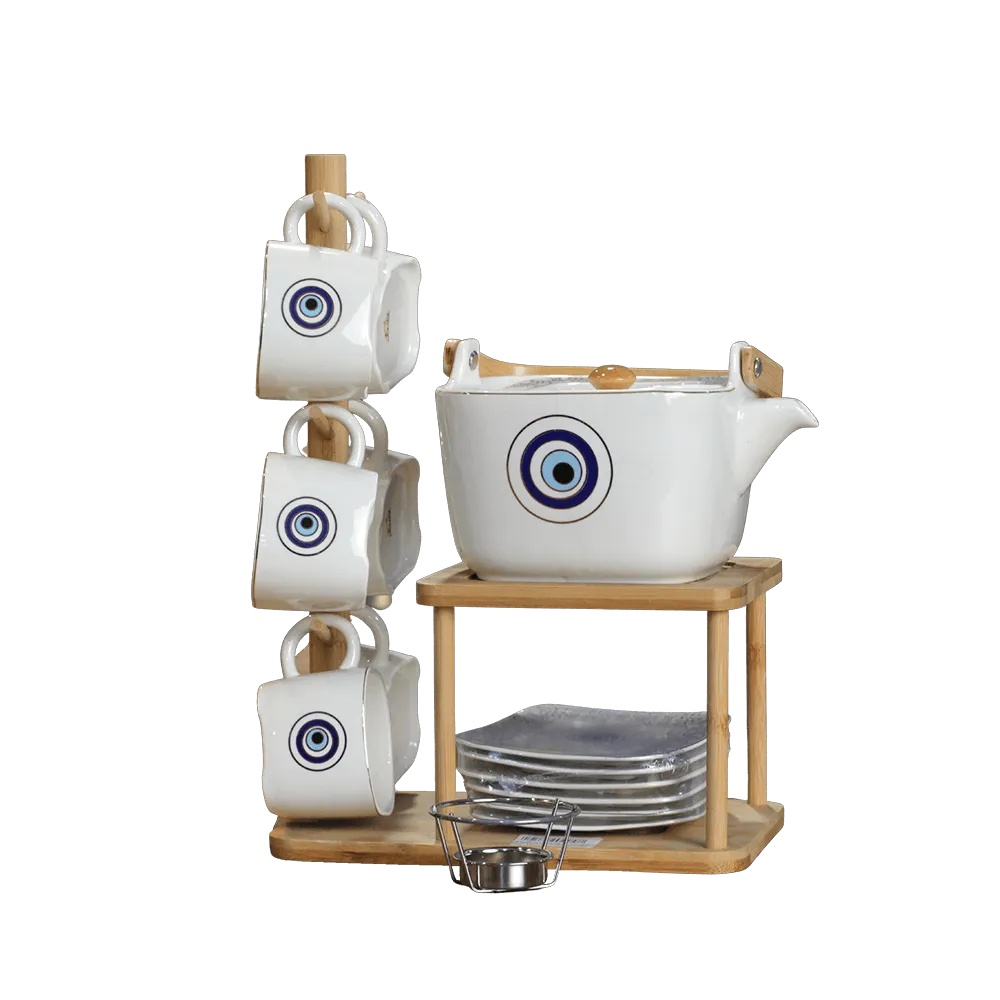 Momaz Blue Eye Marble Tea Set with Wooden Stand