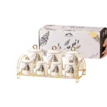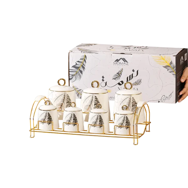 Includes 7 porcelain jars (large & small sizes) with matching lids, all neatly arranged on a golden stand.