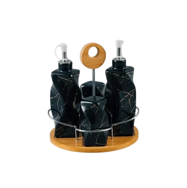 The set is composed of a vinger bottle, oil bottle, and two spices jars. The set includes a wooden stand.