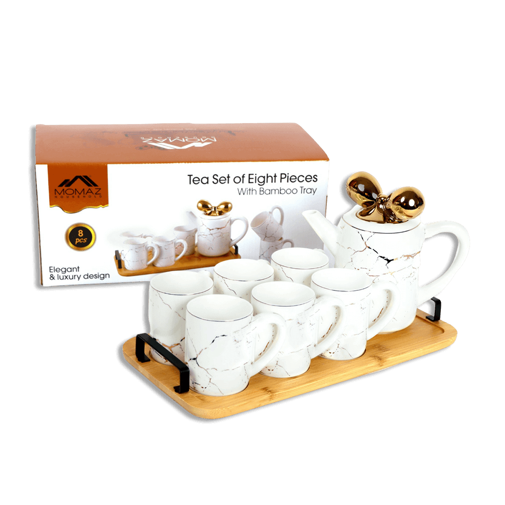 Momaz White Marble Tea Set with Bamboo Tray