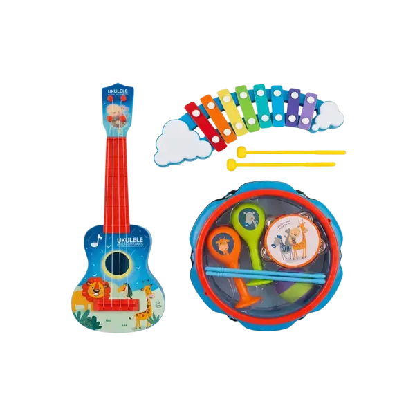 Includes ukulele, xylophone, drum, maracas, tambourine, and drumsticks for varied musical play