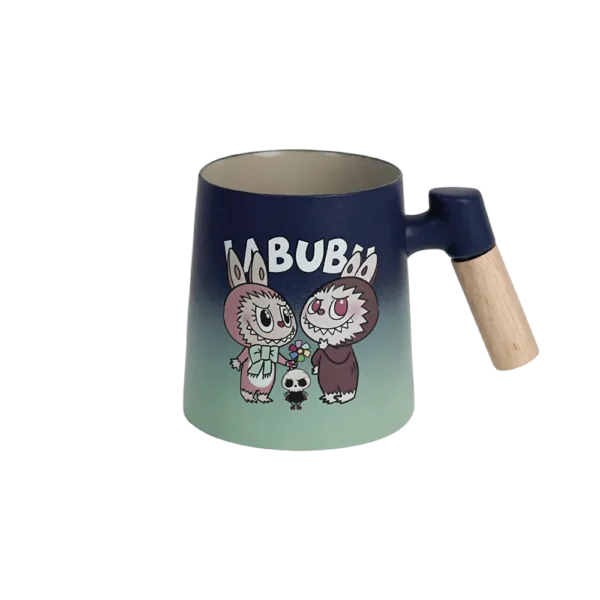 Porcelain Labubu Design Navy Blue Mug with Wooden Handle