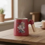 Porcelain Labubu Design Red Mug with Wooden Handle