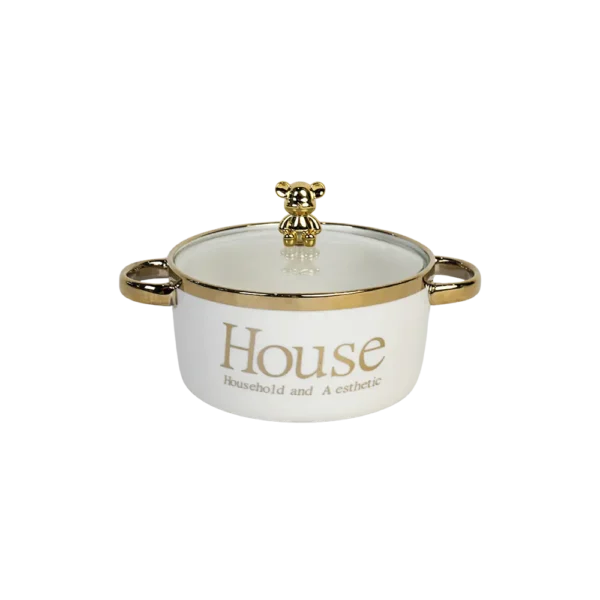 The lid handle is uniquely shaped like a small golden bear, adding a playful and stylish element.