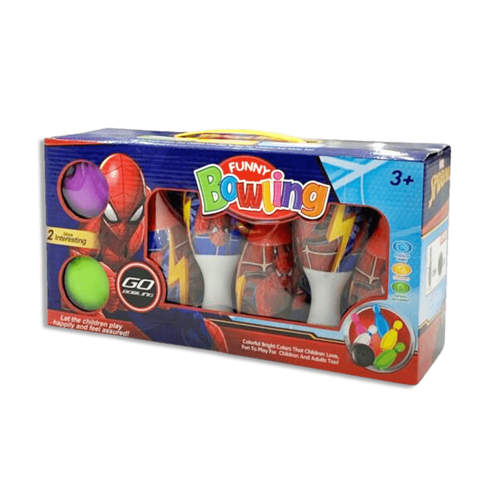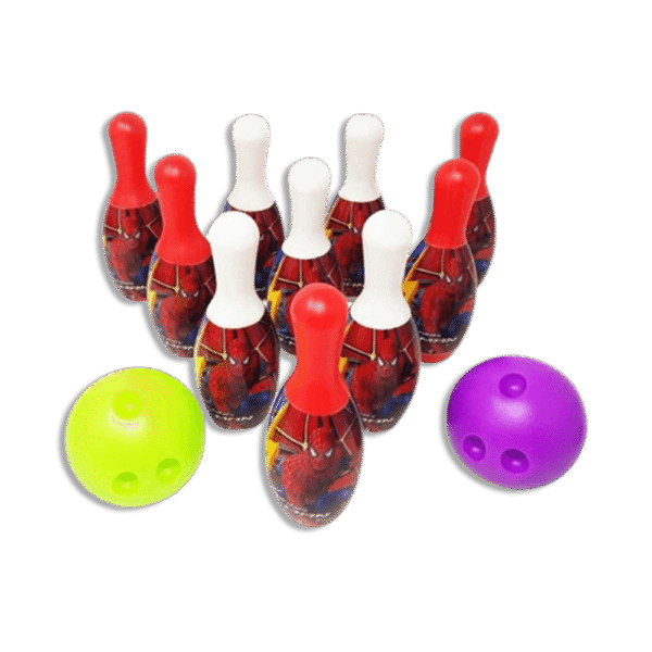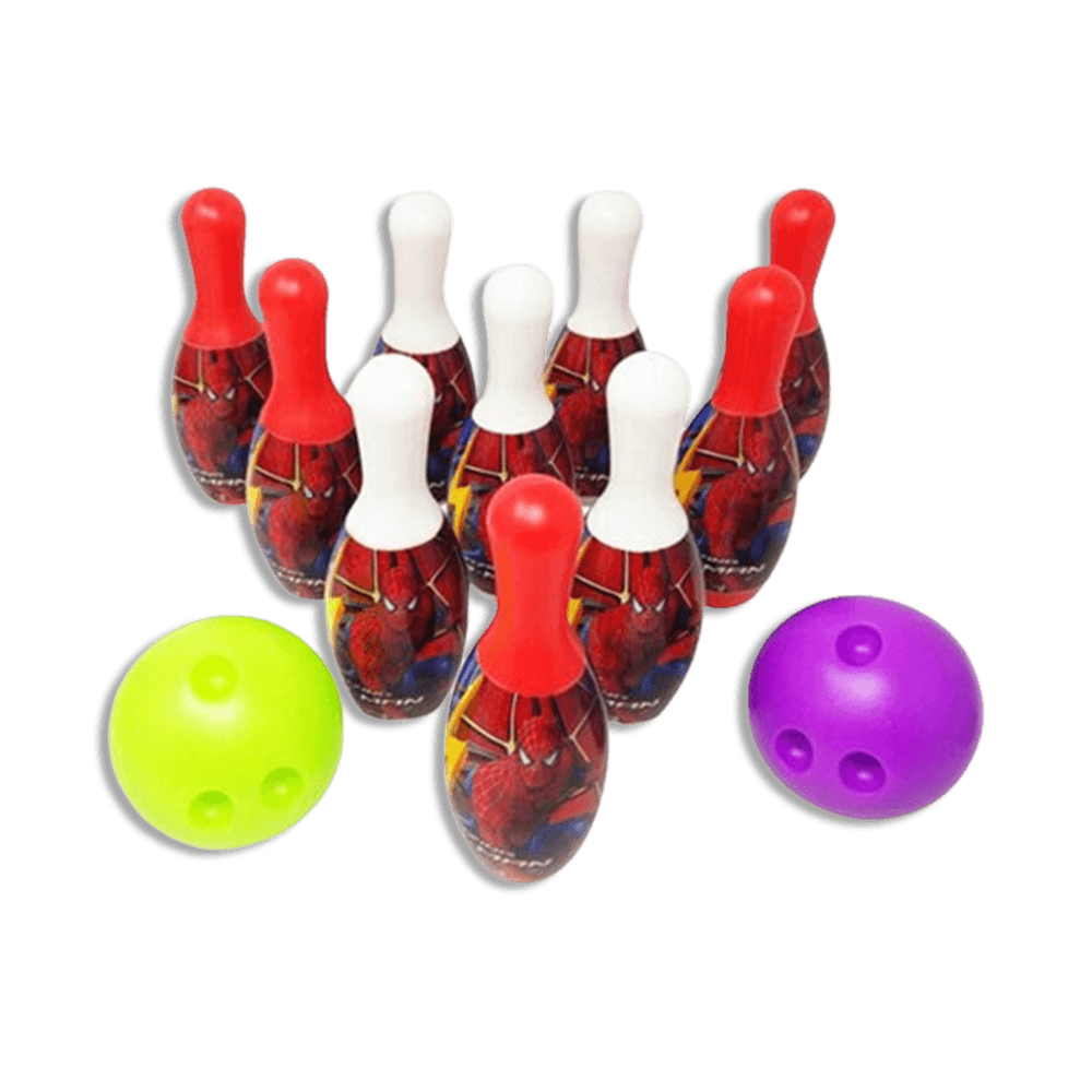 Spiderman bowling set includes 10 pins and 2 bowling balls..