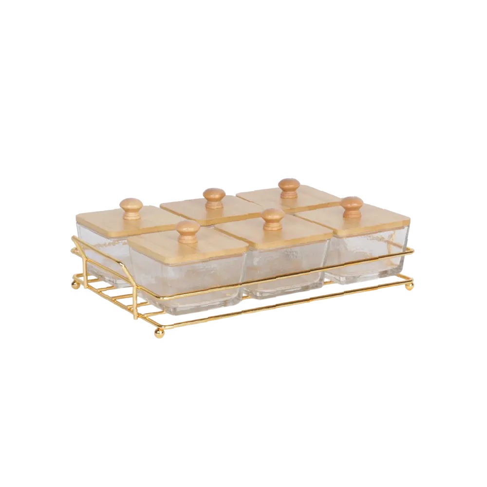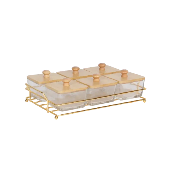 Transparent 6-Sections Serving Set with Wooden Lids & Iron Stand