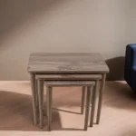 Three tables in varying sizes that conveniently stack together, perfect for small spaces.