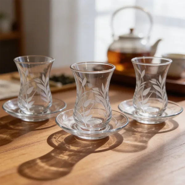 Viena Elegant Glass Leaf-Pattern 3pcs Tea Cups & Saucer Set 120mlطقم كاسات شاي بنقشة أوراق مع صحون – 3 قطع 120ml