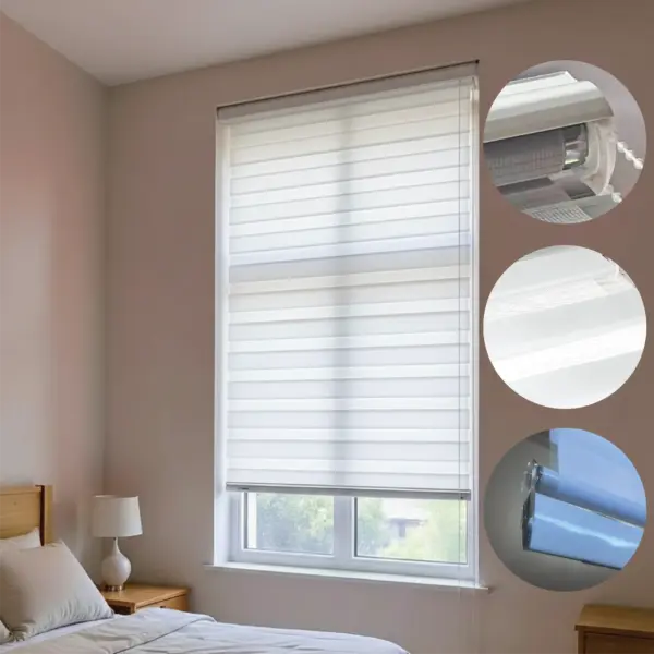 Alternating sheer and opaque horizontal stripes for adjustable light control.